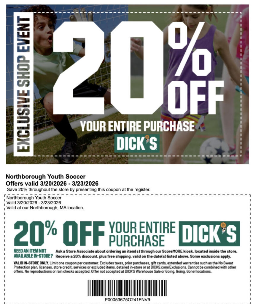 Gear up for the Soccer Season at DICK’S Sporting Goods! Save the dates and save the coupon for 20% off your purchase at Dick’s Sporting Goods in Northborough. 3/20 – 3/23 CLICK HERE FOR YOUR IN-STORE COUPON